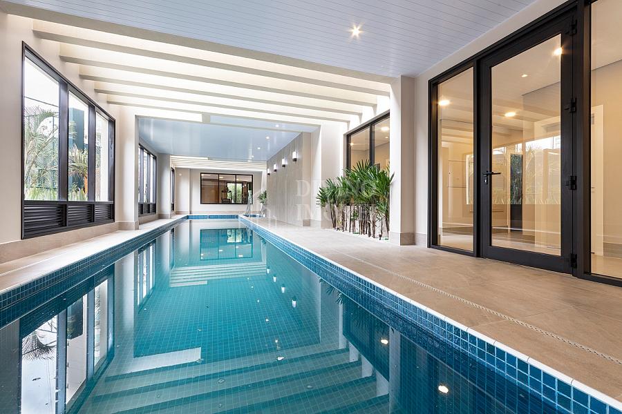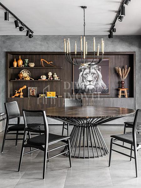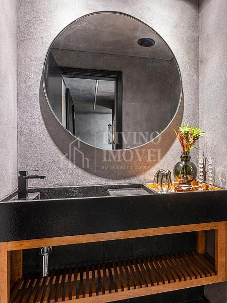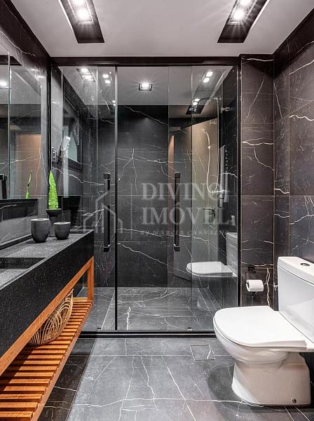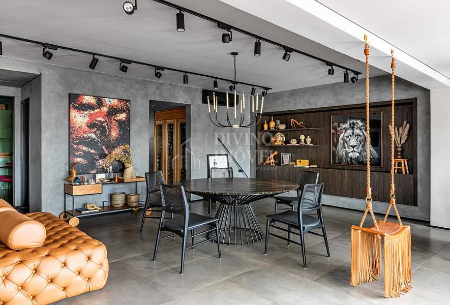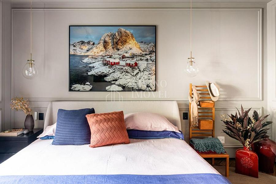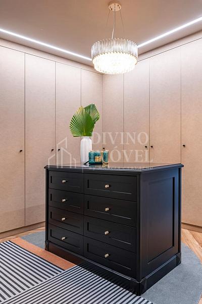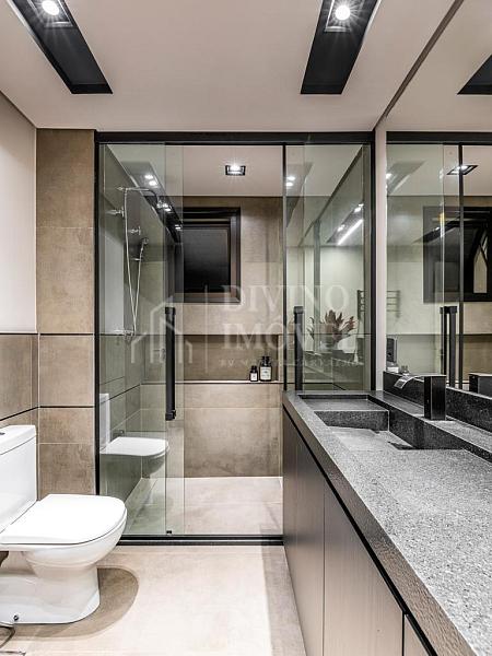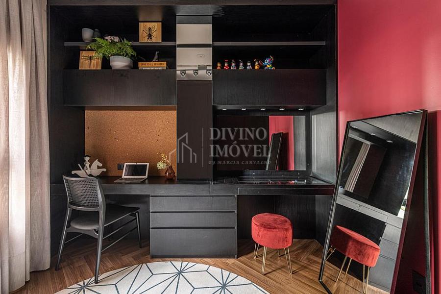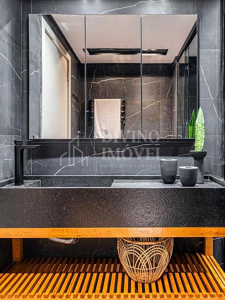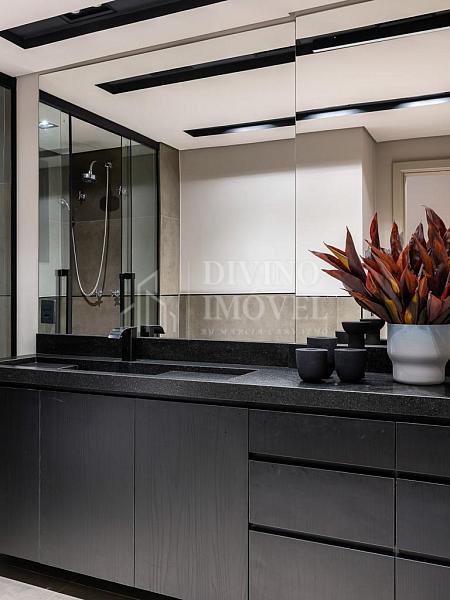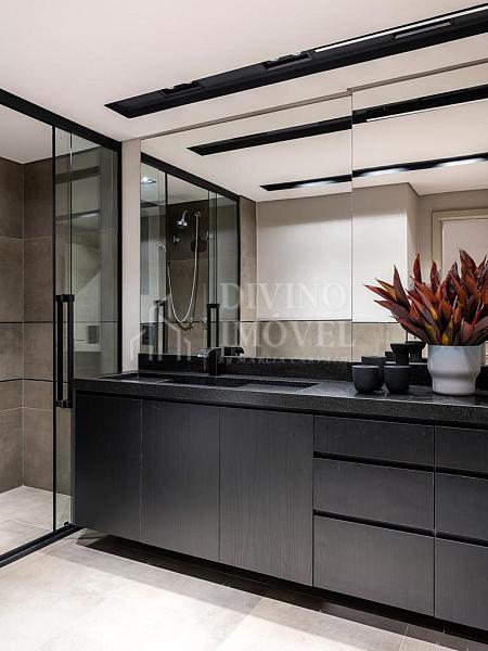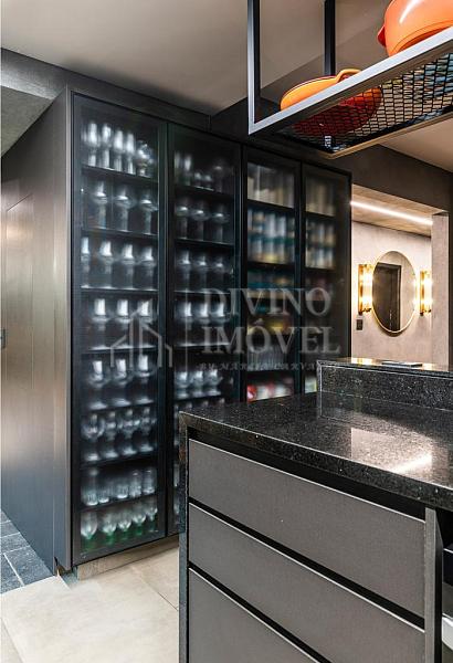 A suíte máster oferece sala de banho dupla e janelas automatizadas. Cozinha extremante funcional e bem iluminada naturalmente, com sala de almoço planejada, além da adega climatizada para 400 garrafas.